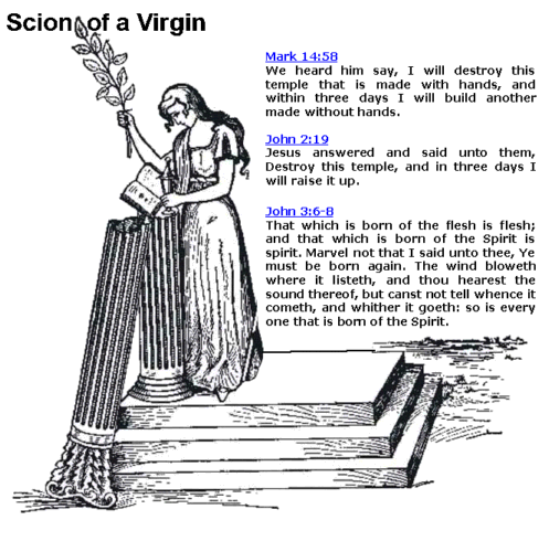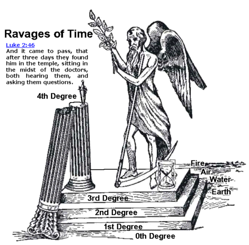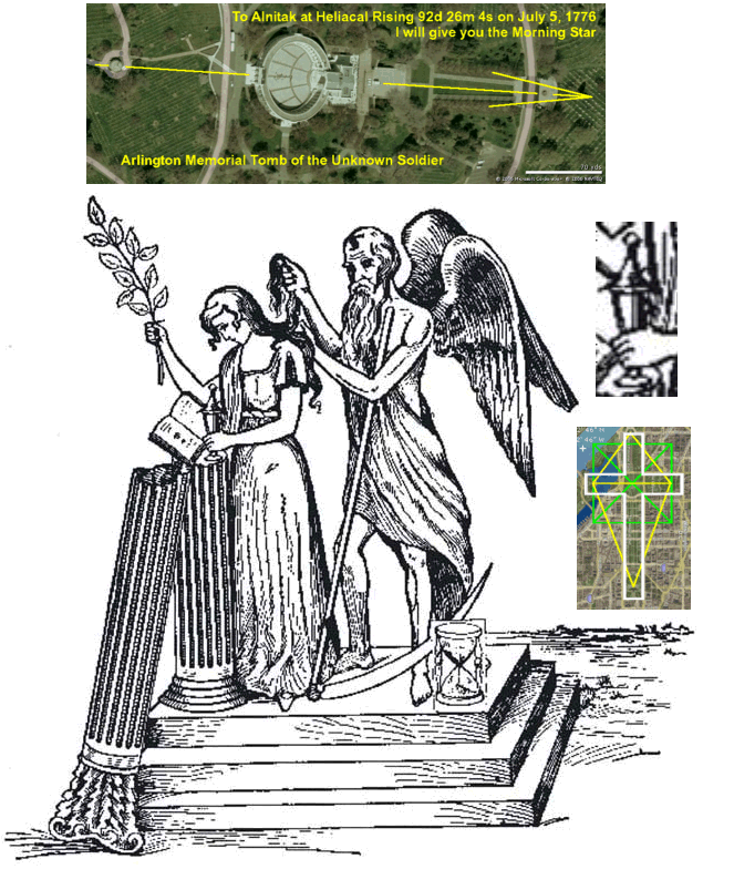 This Masonic 3° symbolic pedestal shows what Abu Musab al-Zarqawi dreamed. On the standing remains of the broken Pillar of Fire are the funerary remains of ancient souls. There the Virgin of Destiny reads a book and waves herbs in the sorcery of reincarnation. At her feet the Father of Time places the crescent of a New Moon on the three stair pyramid of an ancient Ben-ben. The goal of the vignette and of Columbia's Sorcery is the same as the goal of the Staves of Washington, D.C., reincarnation of the Prince of Peace as the Inspiration of Innocence. The four elements, earth, water, air, and fire are represented by the land, the herb, the book, and the broken pillar. The three realms of cosmic domain are represented by the three stepped pyramid, the Virgin Mother, the Time Father, and the vessel of the remains of a Soul. This is the Dark Side of the Ben-ben, for the Light of the Ancient World is beneath the Elevated Landing.