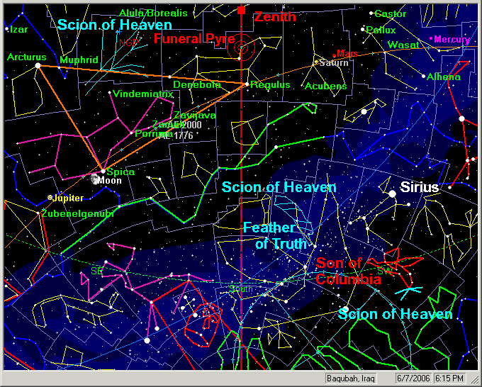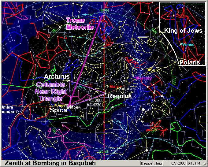 The proximity of Regulus and the conjunction of the triangle of Regulus, Spica, and Arcturus, which represent Heaven's Righteousness, to the zenith at the demise of the body of Abu Musab al-Zarqawi tell us that the spirit of Apollyon 9/11 has been brought down to earth by the Sons of Columbia. On the Triangle of Columbia are Denebola and Murphid. These stars bound The Pond and the Herb of the Virgin, Coma Berenices. This is the Bethlehem, the House of Bread that fed the Israelites in their journey out of Egypt. Within the Pond, the Herb, and the Hair of the Virgin stands a pillar of the pool of stars known as the Milky Way. The Pillar of the Flower, the Inspiration of Heaven's Eternal Fire, is the axis of a Star System called the Solar System. This is the place of the Seventy Two Virgins to which all faiths aspire.